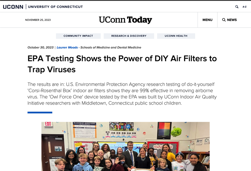 The results are in: U.S. Environmental Protection Agency research testing of do-it-yourself ‘Corsi-Rosenthal Box’ indoor air filters shows they are 99% effective in removing airborne virus. The 'Owl Force One' device tested by the EPA was built by UConn Indoor Air Quality Initiative researchers with Middletown, Connecticut public school children.